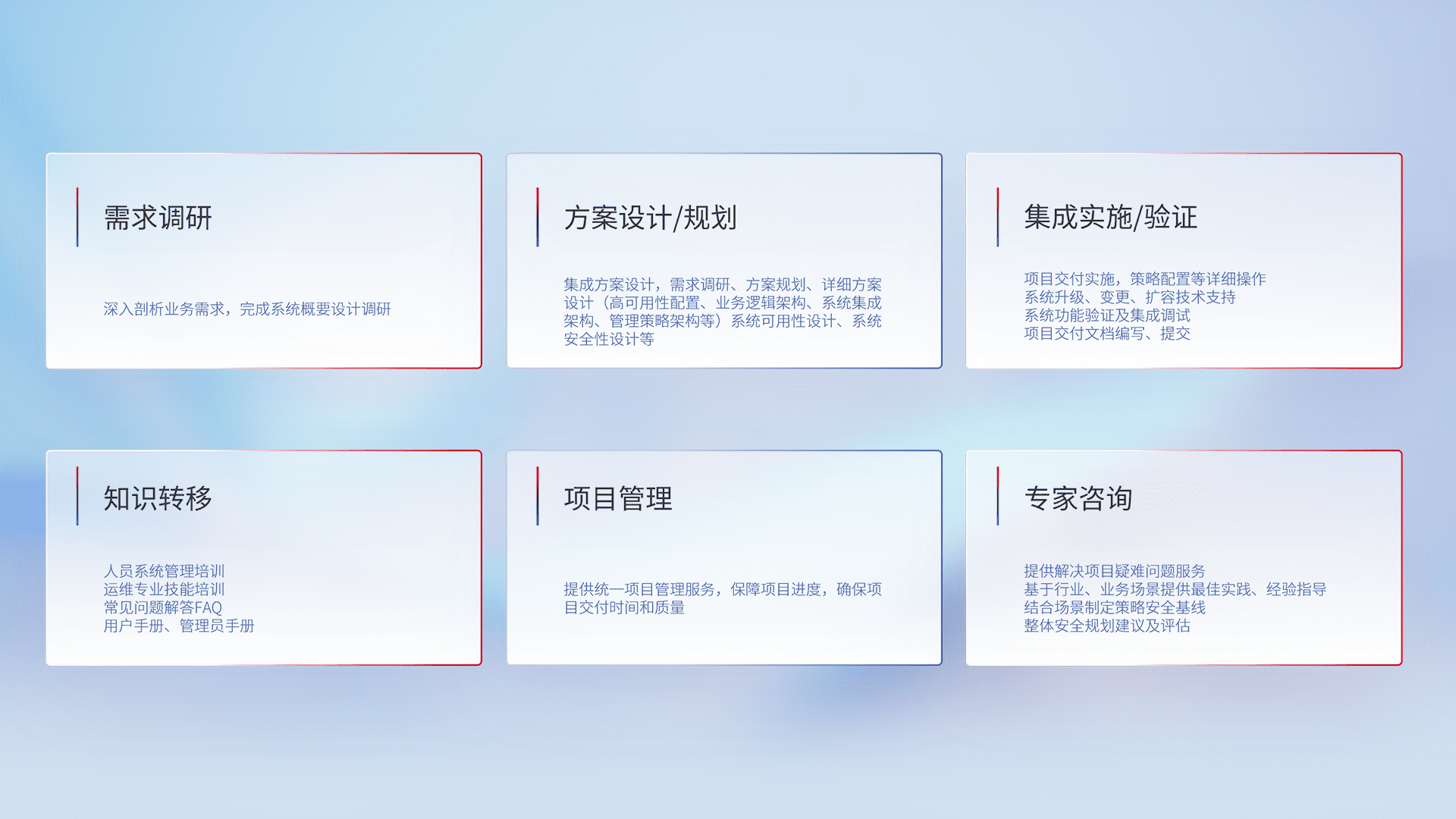 针对客户行业特性,,,,将宏观的安全战略和需求,,,通过专业的交付服务,,,实现项目落地,,为客户提供标准规范的集成交付服务。。。